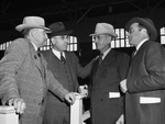 Visitors to the Southwestern Exposition and Fat Stock Show included, left to right, Craig M. Logan, superintendent of the Texas Shorthorn Cattle Association, Howard Gramlich, secretary of the Shorthorn Association, D. W. Williams, head of the animal husbandry department at Texas Agricultural and Mechanical College, and Clem Larson, field representative of the Shorthorn Association. All four men are wearing suits, cowboy hats and eyeglasses. Gramlich has his hand Williams' shoulder. Williams is holding a mostly burnt out cigar.