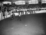 Southwestern Exposition and Fat Stock Show's Nesbitt the Clown and a Brahma bull.