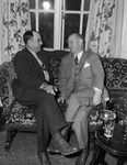 Pictured left to right are R. M. Bowen and John Collier Senior. The men are sitting on a floral couch with their legs crossed. Mr. Bowen is dressed in a double breasted, pinstripe suit. Mr. Collier is wearing a three-piece suit with a pocket square. Glasses of ice water are sitting on the coffee table.