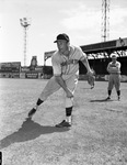 Claud Horton, pitcher for the Fort Worth Cats minor league baseball team. He is pictured just after throwing a pitch. His body is leaned forward, his right arm is across his body and his legs are wide apart. He is wearing hid Fort Worth Cats uniform and a dark baseball cap. Behind him, a couple other players can be seen on the field.