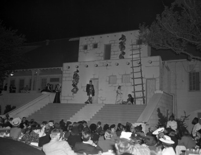 Fair style show at River Crest Country Club. Pueblo background, Mrs. Thelma Hendricks at left, announcing and speaking to a large group of people.