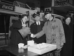 North Fort Worth Flood scene. Left to right, Mrs. R. McNeiland pouring coffee for fireman. W. J. Williams looks on.