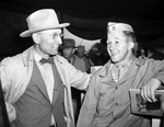 Cattlemen from all over are traveling to Silver Creek Farms for the Hereford auction. The bidders are eager for a chance to purchase the highly esteemed cattle. In attendance, left to right, are Bob Lazear and Lieutenant M. E. Genrich. The men are shown laughing over a funny story. Mr. Lazear is the manager of the Wyoming Hereford Ranch in Cheyenne, Wyoming. He is dressed in a cowboy hat, button-up shirt, bow tie, checkered blazer, and a coat. Lieutenant Genrich is a 1938 graduate of Iowa State and is currently stationed at Camp Shelby, Mississippi. Before joining the army, he was with the Dean Hereford Ranch, near Fort Worth, Texas. He is dressed in his military uniform.