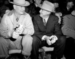 Cattlemen from all over are traveling to Silver Creek Farms for the Hereford auction. The bidders are eager for a chance to purchase the highly esteemed cattle. In attendance, left to right, are Sam Lard and R. T. Alexander. Mr. Lard is from the Ladder Ranch in Hillsboro, New Mexico. He is wearing a cowboy hat, collared shirt, necktie, sweater, coat, trousers, and cowboy boots. Mr. Alexander is a registered Hereford breeder at Canadian. He is dressed in a cowboy hat and a double breasted three-piece suit.