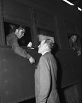 Lord and Lady Halifax in Fort Worth. Private John D. Ellis, Whiteville, North Carolina is leaning out of a train window speaking with Lord Halifax. Lord Halifax has cigarette holder in his mouth.
