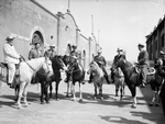 Lord Halifax is riding a multicolored horse. There are a few unidentified men on horseback and men standing next Lord Halifax.