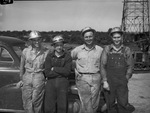 Crew members (left to right) J. L. Stockton, R. S. Jackson, Q. L. Phillips and Laverne Harbour working at the Continental Oil Company No. 1 Mueller, P. Hamilton survey, located eight miles east of Bowie, Texas. They are standing in front of an automobile. Stockton and Phillips are wearing long-sleeve collared shirts and trousers. Jackson and Harbour are wearing long-sleeve collared shirts and overalls. All four men are wearing hard hats. In the background, at right, is the oil rig.