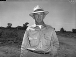 W. E. Jeter, petroleum worker at the Continental Oil Company No. 1 Mueller, P. Hamilton survey, located eight miles east of Bowie, Texas. Jeter is a tool pusher at the oil well. He is standing outdoors, wearing a long-sleeve, button-down shirt, trousers and a hat.