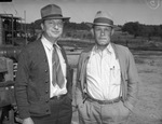 Cecil Allen, left, business man from Bowie, Texas, and M. H. Hasley, of the Staley Oil Company, of Wichita Falls, Texas, pictured at the Continental Oil Company No. 1 Mueller oil well located eight miles east of Bowie, Texas. Both men are wearing collared shirts, trousers, coats and hats. Oil well drilling machinery is visible in the background, at left.