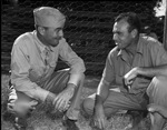 The Consolidated Aircraft plant has organized their first athletic team. The "Bomber" baseball team is playing in the amateur Major City League. Their amateur players are Private Vincent Devaney, left, and Manager Texas Carleton. Private Devaney will open on the mound for the Major City All-Stars at LaGrave Field. Private Devaney is squatting on the field. He is dressed in his military uniform. Mr. Carleton is crouching on the field and smoking a cigarette. He is dressed in a button-up shirt and trousers.