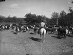 Here is Snooks, a nine-year-old white horse and his owner, Grady Blue, manager of the S. B. Cantey Estate ranch near Palo Pinto in action. This pair has won the championship in the cutting horse contest at the Texas Cowboy Reunion at Stamford in 1940, at Mineral Wells and Southwestern Exposition and Fat Stock Show at Fort Worth in 1941 and 1942. The image implies beginning of work. Grady Blue rides into the herd to look it over and out the desired cattle.