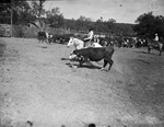 Here is Snooks, a nine-year-old white horse and his owner, Grady Blue, manager of the S. B. Cantey Estate ranch near Palo Pinto in action. This pair has won the championship in the cutting horse contest at the Texas Cowboy Reunion at Stamford in 1940, at Mineral Wells and Southwestern Exposition and Fat Stock Show at Fort Worth in 1941 and 1942. The heifer makes a quick stop hoping to get back into the herd, but Snooks has a different idea. Note how the horse keeps an eye on the heifer. Grady Blue is mounted on the horse and is wearing a cowboy hat. There is a cattle-herd and an unidentified man on the horse in the background.