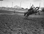 Texas Cowboy Reunion at Stamford. Dub Bizzell, Albany, bareback bronc rider. In the image, Bizzell is on a horse in a cowboy attire and is on a horse, trying to tame it. There is an unidentified person on the field. There are bleachers with crowds, electric poles and buildings in the background.