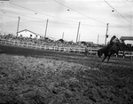 Texas Cowboy Reunion at Stamford. An unidentified saddle bronc rider taming a horse in the field while the crowd watches him from behind the fence. He is in his cowboy attire. There is another unidentified person on the field holding a rope. There are utility poles behind the bleachers. There are unidentified objects hanging from the electric wires. In the background are horses, tents, buildings and horses in the background.
