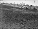 Texas Cowboy Reunion at Stamford. Boley Cotton from Albany, Texas, bareback bronc rider, is on the ranch, trying to control a horse. The horse has its hind legs in the air. On the ranch are two unidentified people on horses and an unidentified person standing and holding a rope. There are sparsely populated crowds on the bleachers, watching Cotton in action. There are utility poles and buildings in the background.