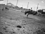 Texas Cowboy Reunion at Stamford. Tom Pearson, Carlsbad, New Mexico, bareback bronc rider. Tom is mounted on a horse, trying to tame it. Both Tom and his horse are in the air, caught in action. There are two unidentified people, one on the horse, on the arena behind Tom. There are crowds on the bleachers in the distant background.