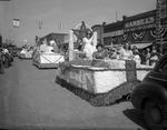 Texas Cowboy Reunion at Stamford. Here is a float that belongs to Rotary Club. There are people on the either side of the float, admiring it. The float is embellished with flowers. There are four unidentified women sitting down and one sitting on star-shaped throne on the float. There are departmental stores on either side of the road.