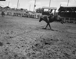Texas Cowboy Reunion at Stamford. V. A. Watts, bareback bronc rider is caught in the action, taming a horse, whose hind legs are still in the air. Watts is wearing a cowboy hat. There are crowds watching him on the bleachers in the background.