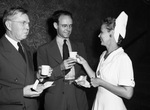 R. E. Cox with Loes Jenkins (left) and Ruth Carter (right) at a publicity event at Worth Theater. The trio is shown engaging in conversation as Miss Carter hands Mr. Cox a small beverage. Both Mr. Cox and Mr. Jenkins are dressed in dark suits while Miss Carter wears a short-sleeve dress and a small hat. Mr. Cox and Mr. Jenkins are also wearing wire-frame eyeglasses and holding doughnuts in their hands.