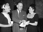 Georgia Millican and Harold Millican, left, at a publicity event at the Worth Theater. Mrs. William K. Hall is offering them doughnuts and drinks. Mr. Millican is wearing a double-breasted suit while the ladies are wearing dresses. Mr. Millican is also wearing a pair of eyeglasses.
