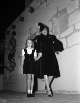 Anseth Helen Teel, left, modeling little girls' clothes, and Miss Ann Lawrence seen escorting her wearing fur at the Fair style show at River Crest Country Club. Anseth Helen Teel is shown modeling a jumper frock as she walks hand in hand with Miss Ann Lawrence, attired in a black velvet coat.