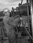 Work at prospective discovery in Northwestern Wise County, Stanolind Oil and Gas Company No. 1. Dovie Menasco, block 9, Falls County School Land, one and one-half miles northwest of Park Springs. is underway. Shown here is A. R. Cox, motorman. Mr. Cox is wearing work clothes and a hard hat and is holding a rope wrapped around a large piece of machinery. Published in the Fort Worth Star-Telegram morning edition, September 6, 1942.
