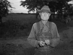 Work at prospective discovery in Northwestern Wise County, Stanolind Oil and Gas Company No. 1. Dovie Menasco, block 9, Falls County School Land, one and one-half miles northwest of Park Springs is underway. Shown here is B. F. McKay of Park Springs, Texas who has the land adjoining the wildcat. He has lived in the area since boyhood. Mr. McKay is wearing overalls and a hat and is standing in a field. Published in the Fort Worth Star-Telegram morning edition, September 6, 1942.