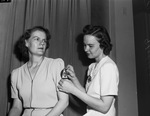 Mrs. Perry Richardson Bass, right, attaching O. C. D. insignia to sleeve of Mrs. Bert K. Smith Jr.
