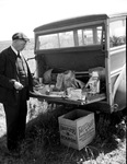 Mill Iron Ranch at Wellington, Texas. K. C. Powell, who drives for Hughes. Mr. Powell is shown standing behind a truck with its trunk pulled down. A plethora of supplies such as shovels and other tools are inside the trunk and on the ground below is a cardboard box. Mr. Powell is wearing a dark suit with a newsboy cap and a pair of eyeglasses. He was driving the ranch car before the late W. E. Hughes, one of the founders of the ranch.