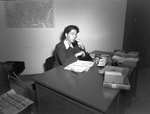 Miss Jean Holloway is sitting at her desk, talking on the telephone. She is running a program in Fort Worth, Texas, that trains women to fly airplanes. Miss Holloway is wearing a collared blouse and a jacket. There is a map of the United States on the back wall. A stack of newspapers from the Fort Worth Star-Telegram is on a table at the left.