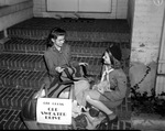 Old Wool Campaign. Ruth Martin (left) and Nancy Poston, Girl Scouts working on old sweater drive. The two girl scouts are shown sitting down on a small, brick staircase and sorting through the discarded woolen sweaters they collected for the Red Cross. Ruth sits on a higher stair than Nancy and holds up a striped sweater from her lap as Nancy looks on with her own sweater. Both are dressed in girl scout uniform and Ruth is also wearing a pair of glasses. Next to the girls is their collection basket with the sign. "Red Cross Old Sweater Drive", on it. Next to the basket are other sweaters that have been collected along bunches of yarn.