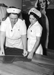 Red Cross workers. Mrs. E. H. Bursey, left, and Mrs. C. J. Davidson, measuring a sweater.