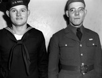 Shown are William Kirby (left) of the U. S. Navy and Orin A. Bunn of the U. S. Army. Two men are standing against a bare wall and wearing their respective uniforms. Orin A. Bunn is also wearing a pair of glasses.