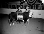 Lieutenant R. B. Tate (left) and Elton Barton are shown with the champion steer at the Houston Fat Stock Show. The steer is owned by Warren Barton of Sweetwater, Texas. Tate and Warren are shown standing behind the large steer and looking forward. Tate is wearing a military uniform and Warren is wearing a cowboy hat and a jacket. On the steer, there is a sign draped over it which names it the grand champion of the stock show. Behind the scene is a fence with a variety of chairs behind it. A few other men can be seen looking on.