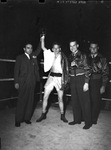 The 1943 Golden Gloves season is concluding with the national fights at the Chicago Tournament of Champions. Competing for the lightweight division is Hubert Gray, of Wichita Falls, Texas. The Texan represented his home on the national stage. He is shown with his right glove in the air as tournament officials proclaimed him the winner.