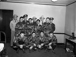 The 1943 Golden Gloves season is concluding with the national fights at the Chicago Tournament of Champions. The amateur competition is being held at Chicago Stadium in Illinois. The fighters and trainers representing the state of Texas are shown gathering before the fights. Squatting on the front row, left to right, are Gene Poletti (heavyweight), Morris Carona (welterweight), Tom Attra (light-heavyweight), and Emil Zoltak (middleweight). On the middle row, left to right, are Manny Ortega (featherweight), Frankie Montoya (bantamweight), Jose Andres (flyweight), and Hubert Gray (lightweight). Five unidentified trainers are standing on the back row. The boxers are wearing matching coats and trousers.