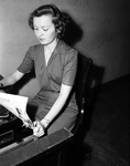 Star-Telegram young woman reporter NaDeane Walker. Miss Walker is shown reading Star-Telegram newspaper as she sits in front of a typewriter at her desk. She is wearing a dress and small watch on her left wrist.