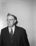Will Fitch, standing against a bare wall. He is pictured from the waist up. He is wearing a three piece suit with a striped necktie and eyeglasses.