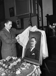 Marvin B. Simpson Junior is unveiling a portrait of the late John A. Kee at a memorial service at Odd Fellows Hall. Mr. Kee was the former treasurer of the 100 F Grand Lodge of Texas. The painting depicts Mr. Kee in a suit with a pocket square. Mr. Simpson is the acting noble grand. He is dressed in a double breasted, pinstripe suit. The portrait is propped up on an easel. In front of the portrait is a table covered in a crochet tablecloth and with a floral centerpiece.