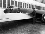 Hicks Field at Fort Worth, Texas. Three unidentified men are shown working on an aircraft; two tending to its wing and one near the cockpit. The men are all wearing military uniforms. In the background is a building with long rows of windows.