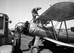 Hicks Field at Fort Worth, Texas. Two unidentified men are shown tending to an aircraft. One is standing on the head of the plane, holding a gas pump, while his companion is on the ground holding up the rest of the pump. Both are wearing coveralls.