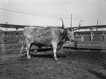 Light colored Longhorn steer standing in profile, its head turned to face the camera, at the Fort Worth Stockyards, probably 1939. There is hay on the ground at the steers hooves. Behind the fence of the stockyard, holding the steer, utility poles can be seen along the horizon. Published in the Fort Worth Star-Telegram.