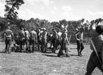 German War prisoners at the Madill Provisional Internment Camp. Shots of the German War Prisioners clearing the Oklahoma lowlands, eating, at the water barrels, going to and from work, cooking, filing into the mess hall. Individuals in these shots are not identified.