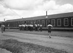 German War prisoners at the Madill Provisional Internment Camp. Shots of the German War Prisioners clearing the Oklahoma lowlands, eating, at the water barrels, going to and from work, cooking, filing into the mess hall. Individuals in these shots are not identified.