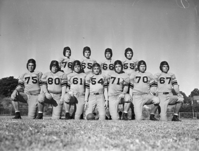 Parents, fans, and alumni have high hopes for the Polytechnic High School football team. They have one of the toughest offensive lines of any school in the District 7AA. Their starting lineup left to right is J. C. Phillips, Reese Moullar, Kenny Baker, Burt Watkins, Robert Wilson, Orville Lyles, and James Jones. On the back row are Buddy Peacock, Bayne Anderson, C. D. Allen, and Frank Smith.