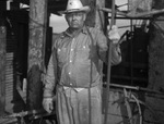 One of the most active areas in the West Central Texas district is the Wimberly pool in Southern Jones County. There is a large crew working on various operations. Shown here is C. W. Freeman, driller at the Butler & Horne et al No.2 Church. Mr. Freeman is wearing work clothes, gloves and a straw hat and is holding a long bar. Published in the Fort Worth Star-Telegram morning edition, July 18, 1943.