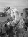 One of the most active areas in the West Central Texas district is the Wimberly pool in Southern Jones County. There is a large crew working on various operations. Shown here is J. L. Pollan, tool dresser at the Burler & Horne No.4. He is bent over and using a hand saw. Mr. Pollan is wearing work clothes and a hat. Published in the Fort Worth Star-Telegram morning edition, July 18, 1943.