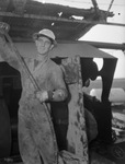 The crewman for the Knappenberger Drilling Company in the Wimberly pool of Southern Jones County, which is the most active area in West Central Texas, are at their various operations. Shown here is L. C. Lovern, derrickman. Mr. Lovern is wearing work clothes and hard hat and holding a thick cable. Published in the Fort Worth Star-Telegram evening edition, September 7, 1943.