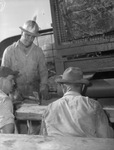 The crewman for the Knappenberger Drilling Company in the Wimberly pool of Southern Jones County, which is the most active area in West Central Texas, are at their various operations. Shown here left to right, I. L. Cornelius, backup man and R. W. Williams, driller, and unidentified man with his back to camera Mr. Cornelius and They seem to be working togther on floor boards. Mr. Cornelius is wearing a hard hat and holding a hammer to the board.