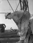 The crewman for the Knappenberger Drilling Company in the Wimberly pool of Southern Jones County, which is the most active area in West Central Texas, are at their various operations. Shown here is Oscar Smith, derrickman. Mr. Smith is wearing work clothes and hard hat and is leaning over to pickin up a piece of lumber. Published in the Fort Worth Star-Telegram evening edition, September 7, 1943.